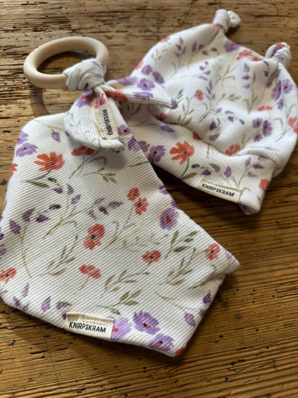 Bestehend aus einer Babymütze, einem Beißring und einem Spucktuch