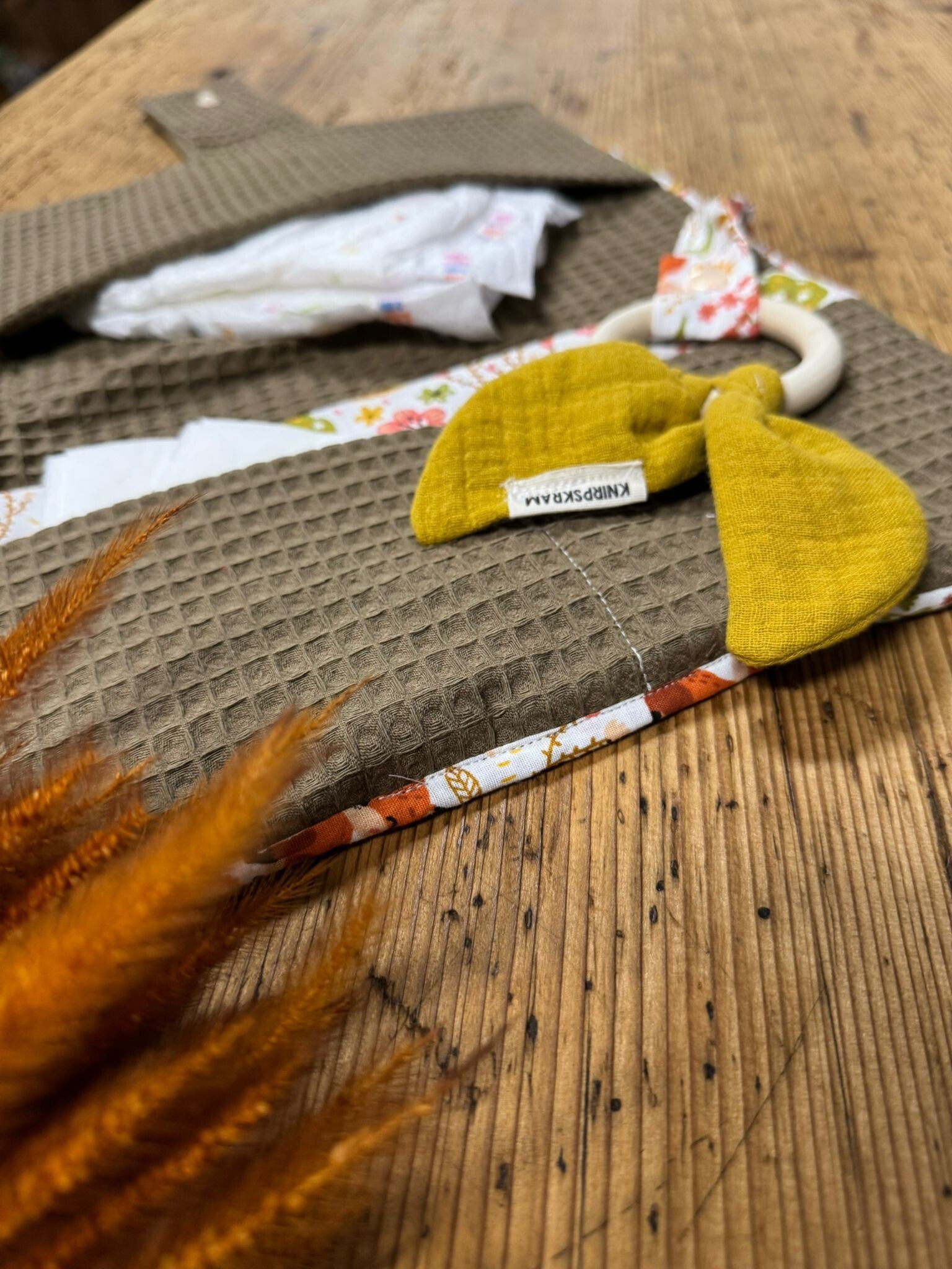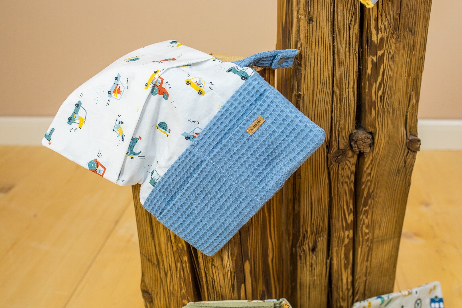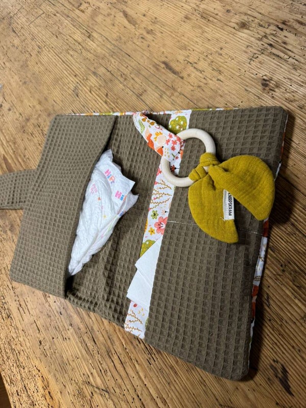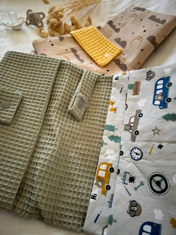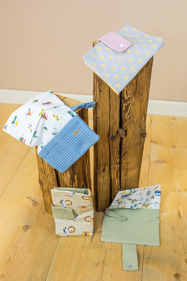 Wir stellen die Windeltasche ganz nach deinen Wünschen her. Sie besteht aus Waffelpiqué und Baumwollstoff, hat ein großes Fach, 4 kleine und einem Band mit Druckknopf für den Schnuller. In unserer Windeltasche lassen sich ganz bequem mehrere Windeln, Feuchttücher, Mutter-Kind-Pass, Wickelunterlagen und Kleinigkeiten gut verstauen.