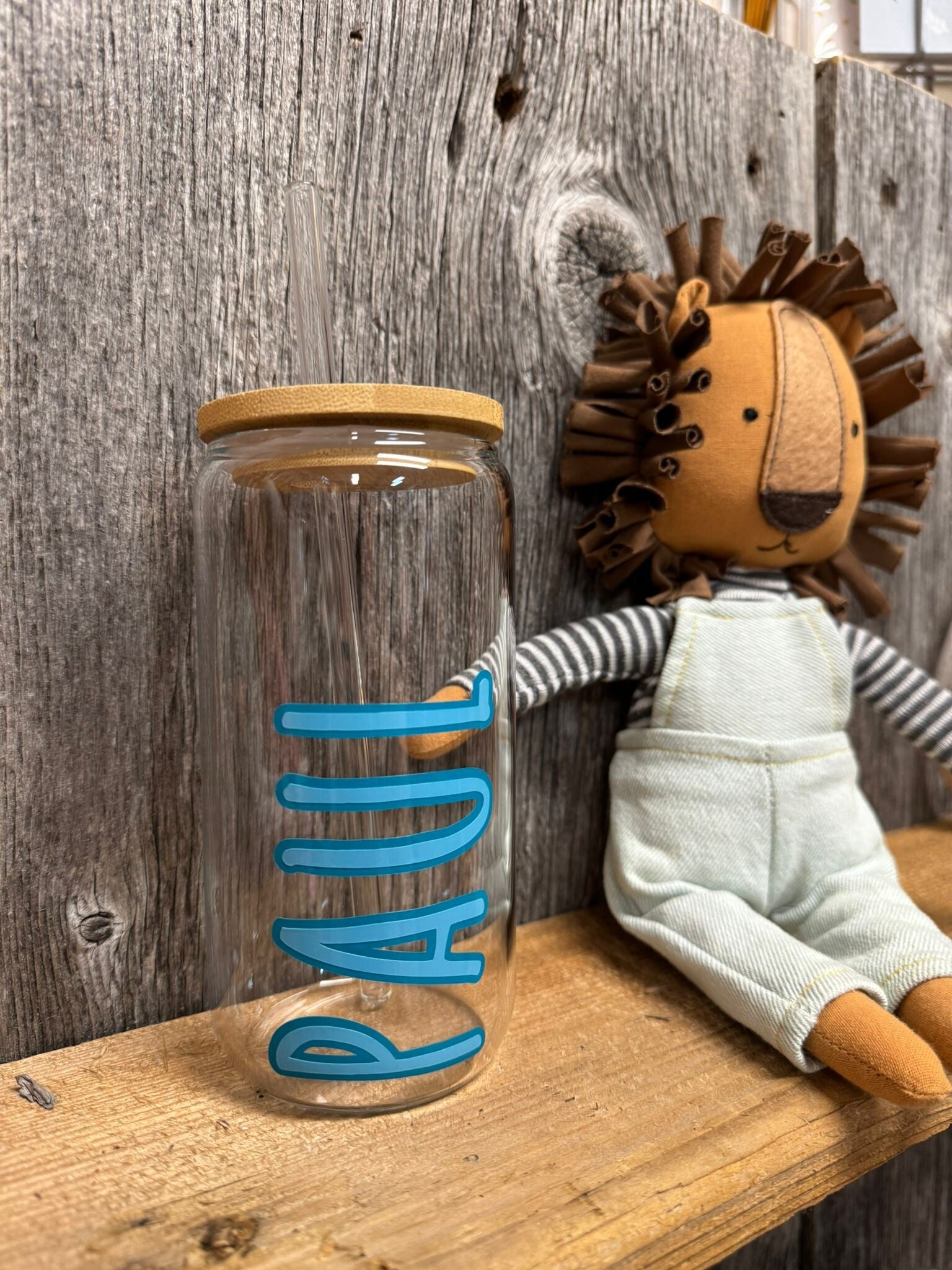 - Einen Trinkbecher aus Glas, ein Bambusdeckel und ein Glasstrohhalm