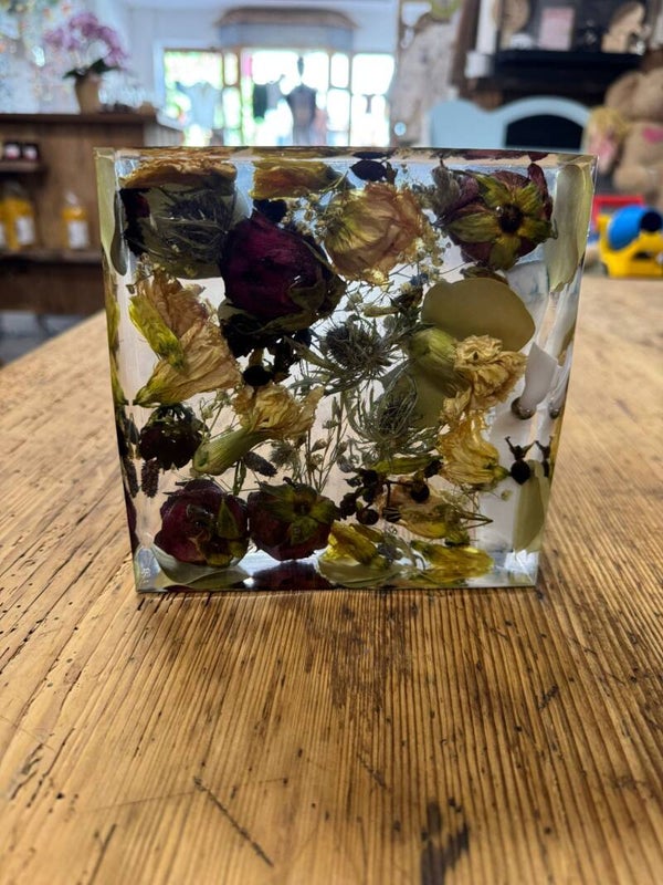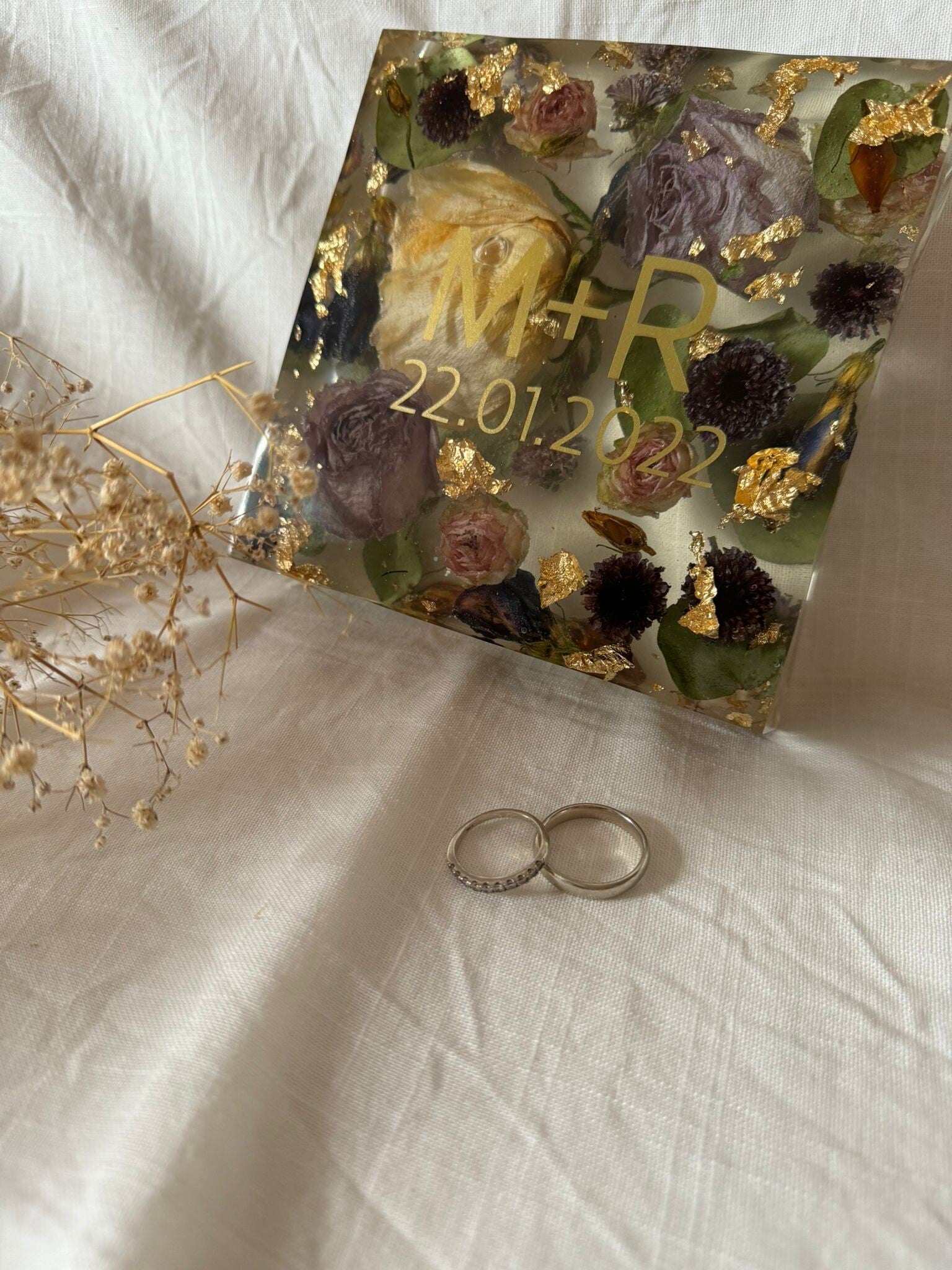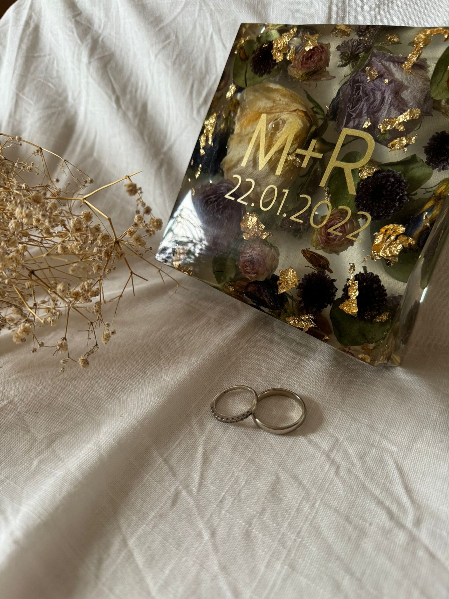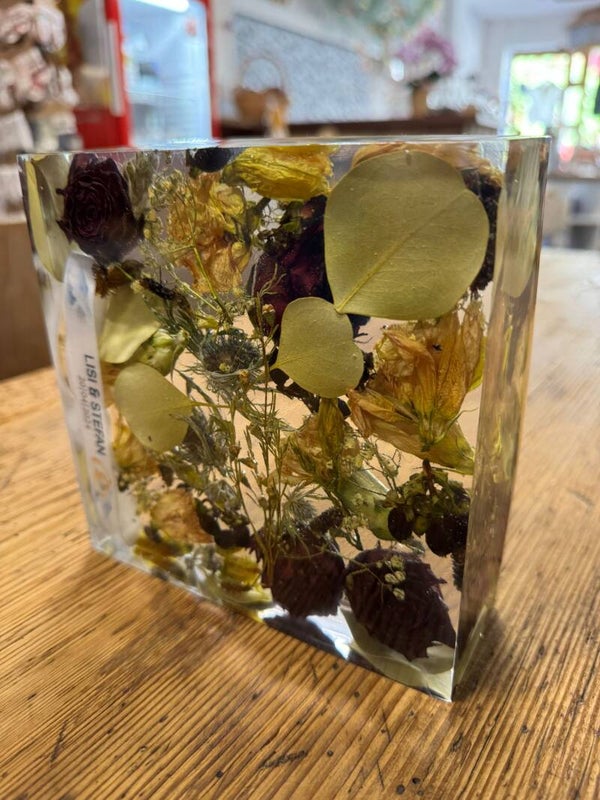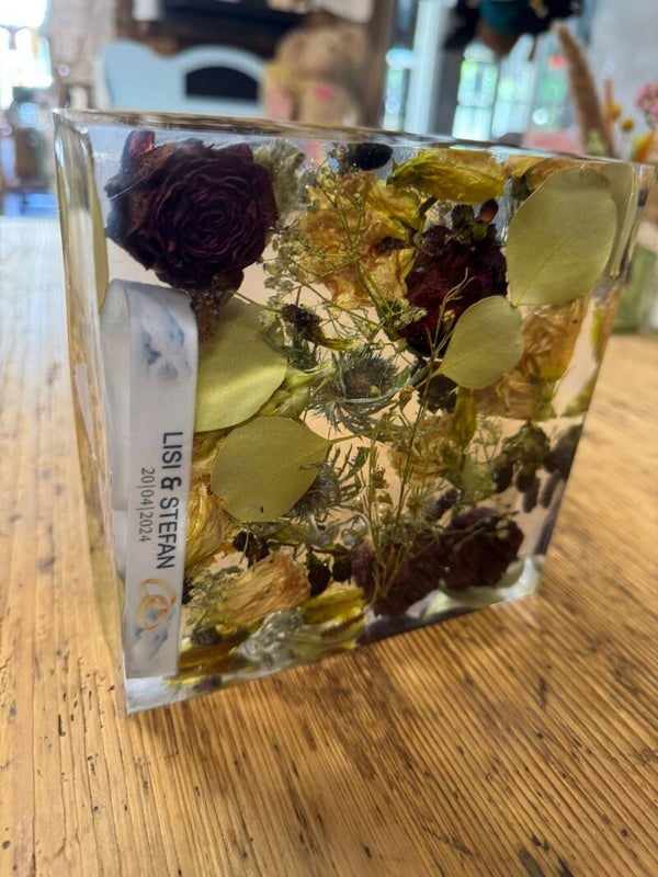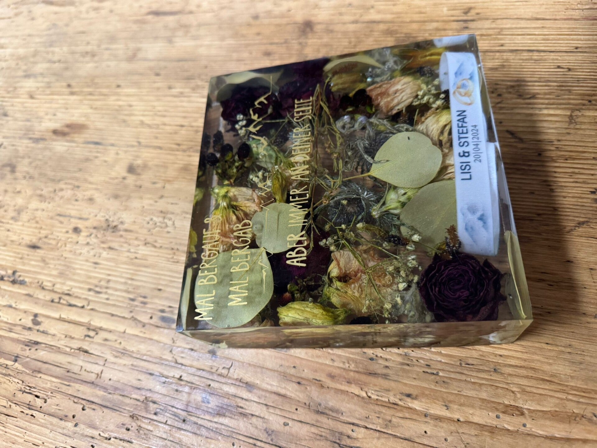Eine wunderschöne Erinnerung an einen der schönsten Tage im Leben: Dein Blumenstrauß liebevoll in hochwertigem Epoxidharz verewigt. Gerne auch mit einer individuellen Beschriftung versehen, die deinem Kunstwerk eine persönliche Note verleiht.