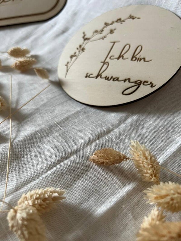 Schöne Holzkarte zur Schwangerschaftsverkündung, ideal als Fotoprop.
