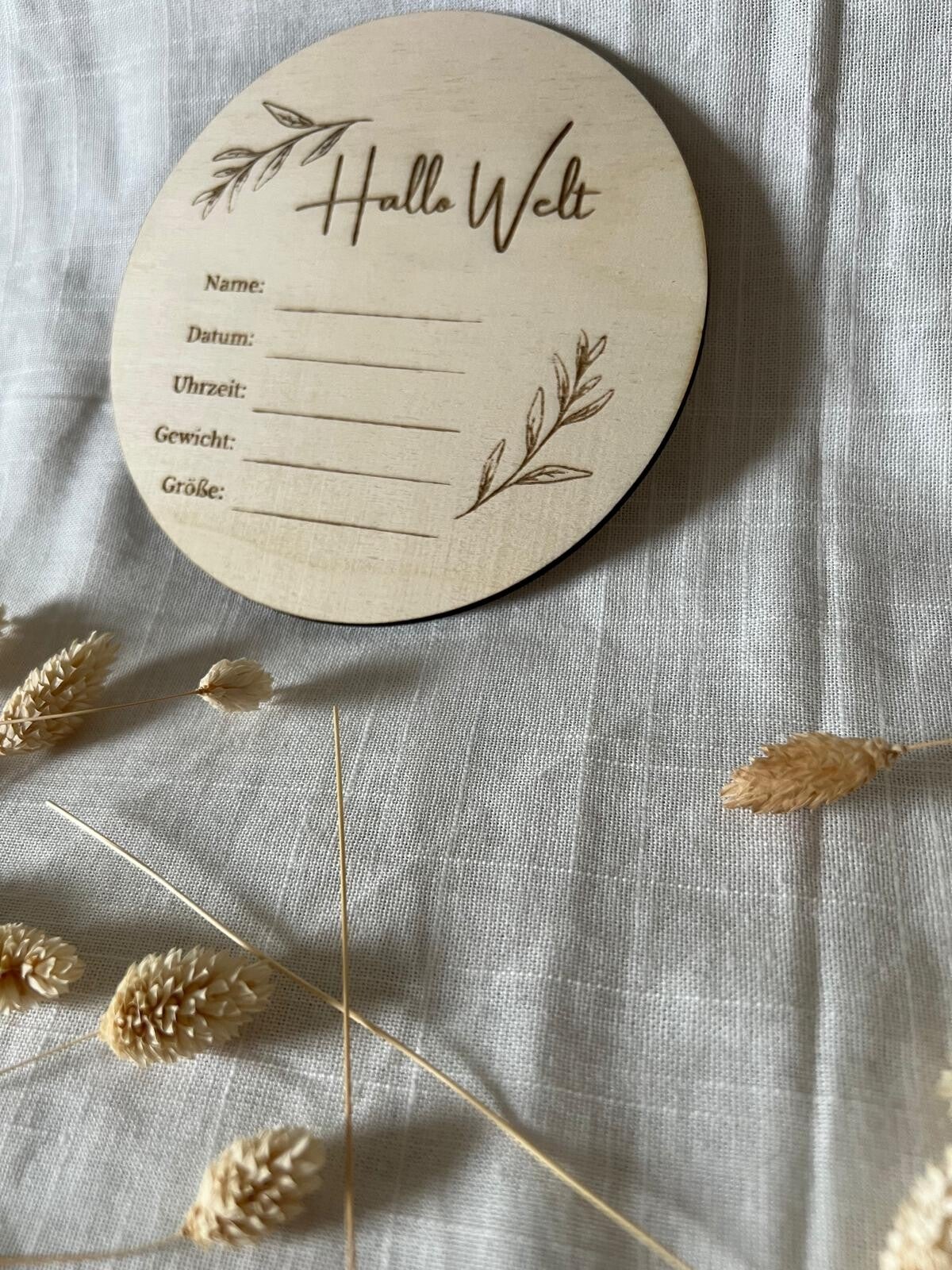Schöne Holzkarte zur Ankündigung der Geburt, ideal als Fotoprop.