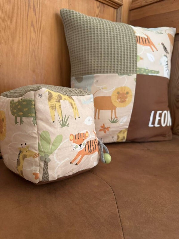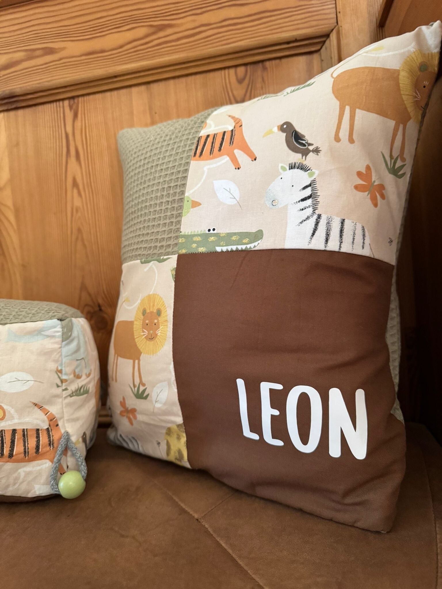 Du kannst den Stoff ganz nach deinem Geschmack auswählen und personalisieren das Kissen nach Wunsch auch gerne mit dem Namen des Kindes.