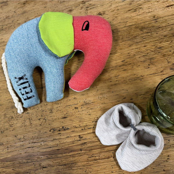 Ein feiner Kuschelelefant für die Kleinsten zum Kuscheln und Spielen - ganz nach deinen Wünschen hergestellt.